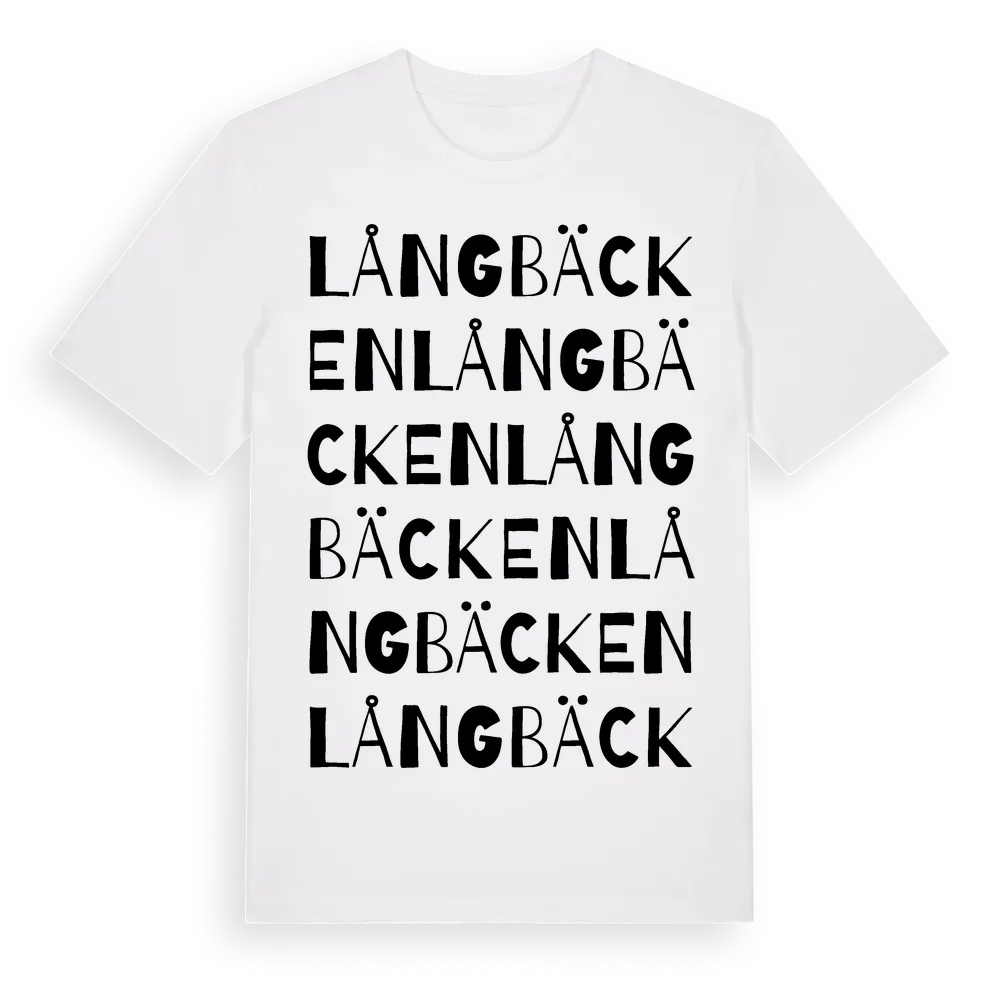 Långbäcken ordlek t-shirt är inspirerad av Långbäcken i Västernorrlands län, Sverige. Tröjan är designad för dig som har en speciell koppling till platsen – oavsett om du bor här, har rötterna här eller bara älskar Långbäcken.