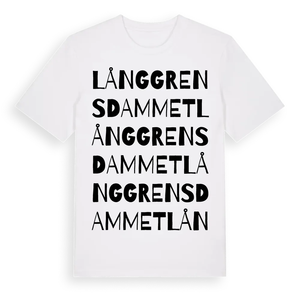 Långgrensdammet ordlek t-shirt är inspirerad av Långgrensdammet i Västernorrlands län, Sverige. Tröjan är designad för dig som har en speciell koppling till platsen – oavsett om du bor här, har rötterna här eller bara älskar Långgrensdammet.