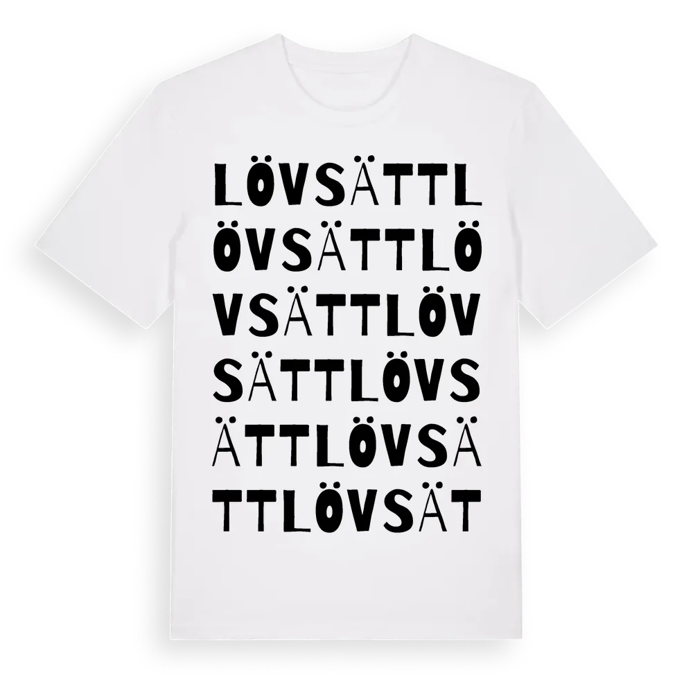 Lövsätt ordlek t-shirt är inspirerad av byn Lövsätt i Västernorrlands län, Sverige. Tröjan är designad för dig som har en speciell koppling till platsen – oavsett om du bor här, har rötterna här eller bara älskar Lövsätt.