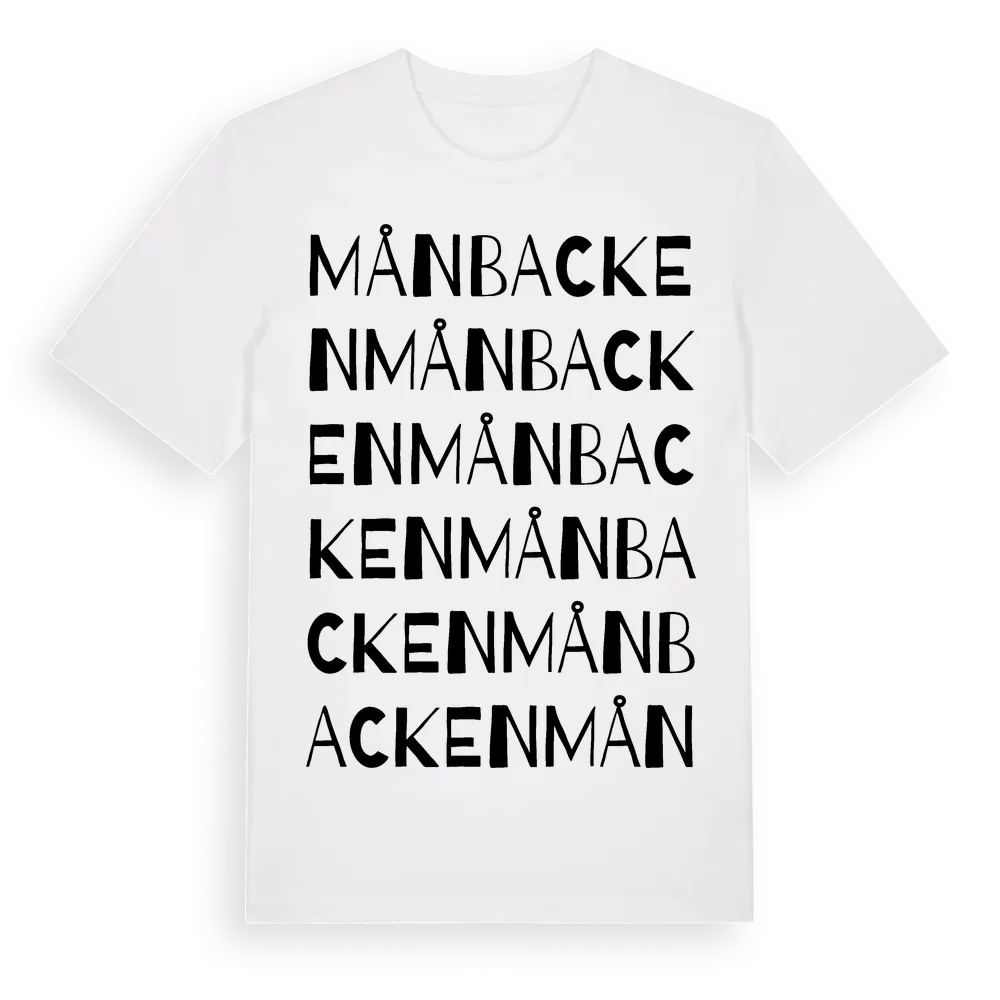 Månbacken ordlek t-shirt är inspirerad av Månbacken i Västernorrlands län, Sverige. Tröjan är designad för dig som har en speciell koppling till platsen – oavsett om du bor här, har rötterna här eller bara älskar Månbacken.