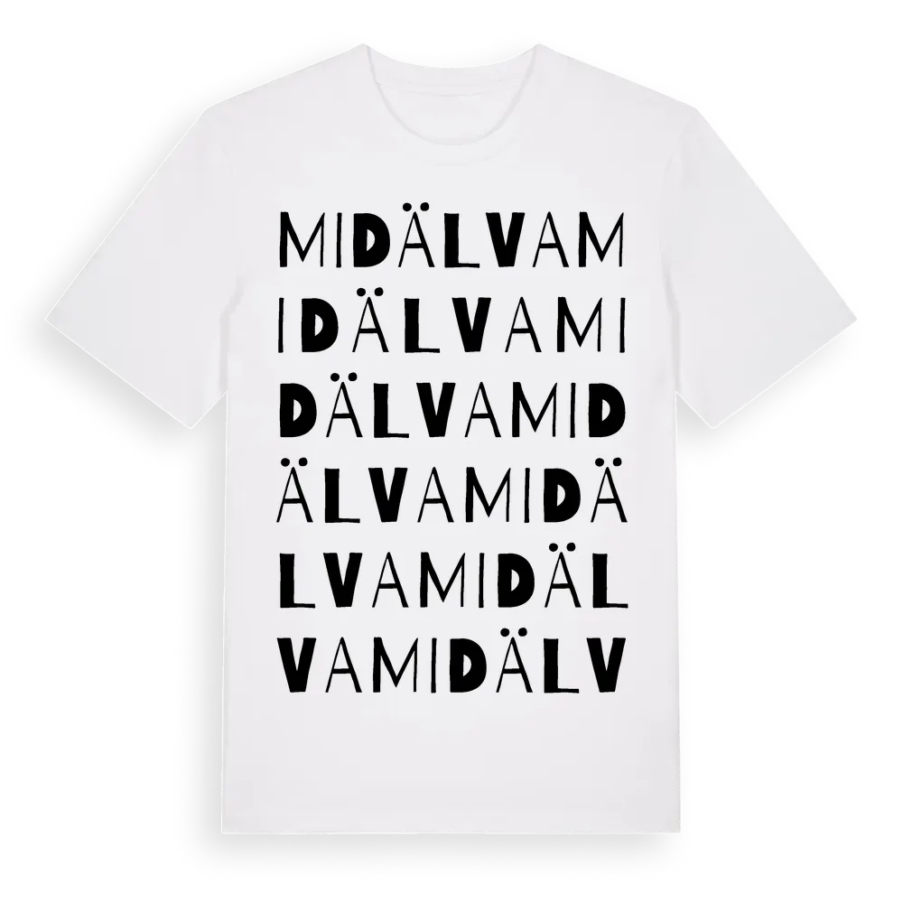 Midälva ordlek t-shirt är inspirerad av stadsdelen Midälva i Västernorrlands län, Sverige. Tröjan är designad för dig som har en speciell koppling till platsen – oavsett om du bor här, har rötterna här eller bara älskar Midälva.