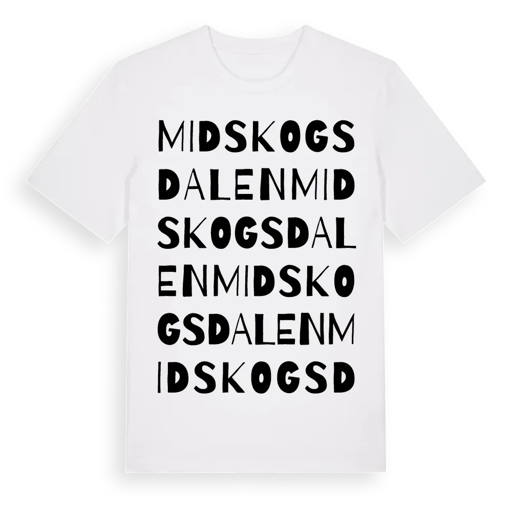 Midskogsdalen ordlek t-shirt är inspirerad av Midskogsdalen i Västernorrlands län, Sverige. Tröjan är designad för dig som har en speciell koppling till platsen – oavsett om du bor här, har rötterna här eller bara älskar Midskogsdalen.