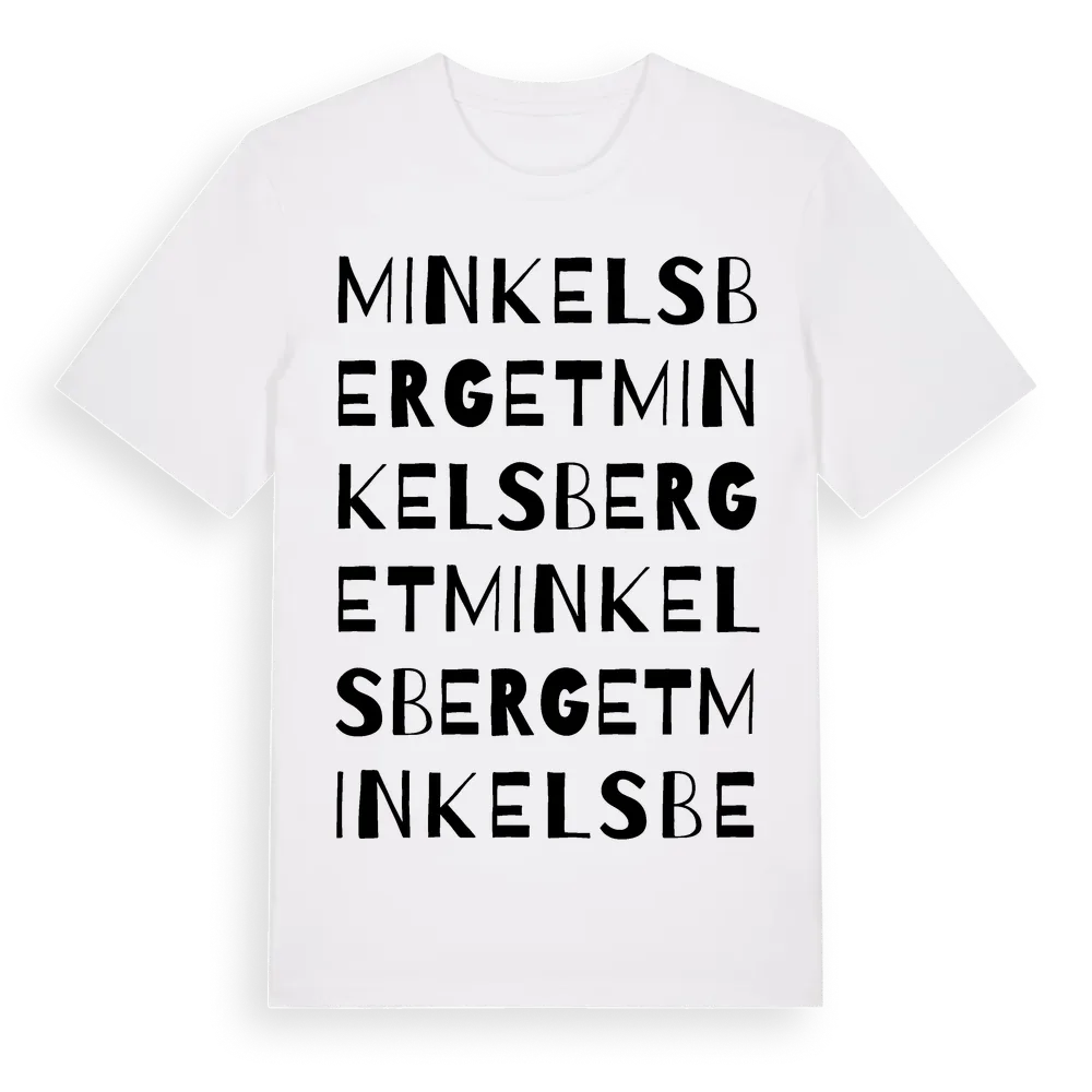 Minkelsberget ordlek t-shirt är inspirerad av Minkelsberget i Västernorrlands län, Sverige. Tröjan är designad för dig som har en speciell koppling till platsen – oavsett om du bor här, har rötterna här eller bara älskar Minkelsberget.