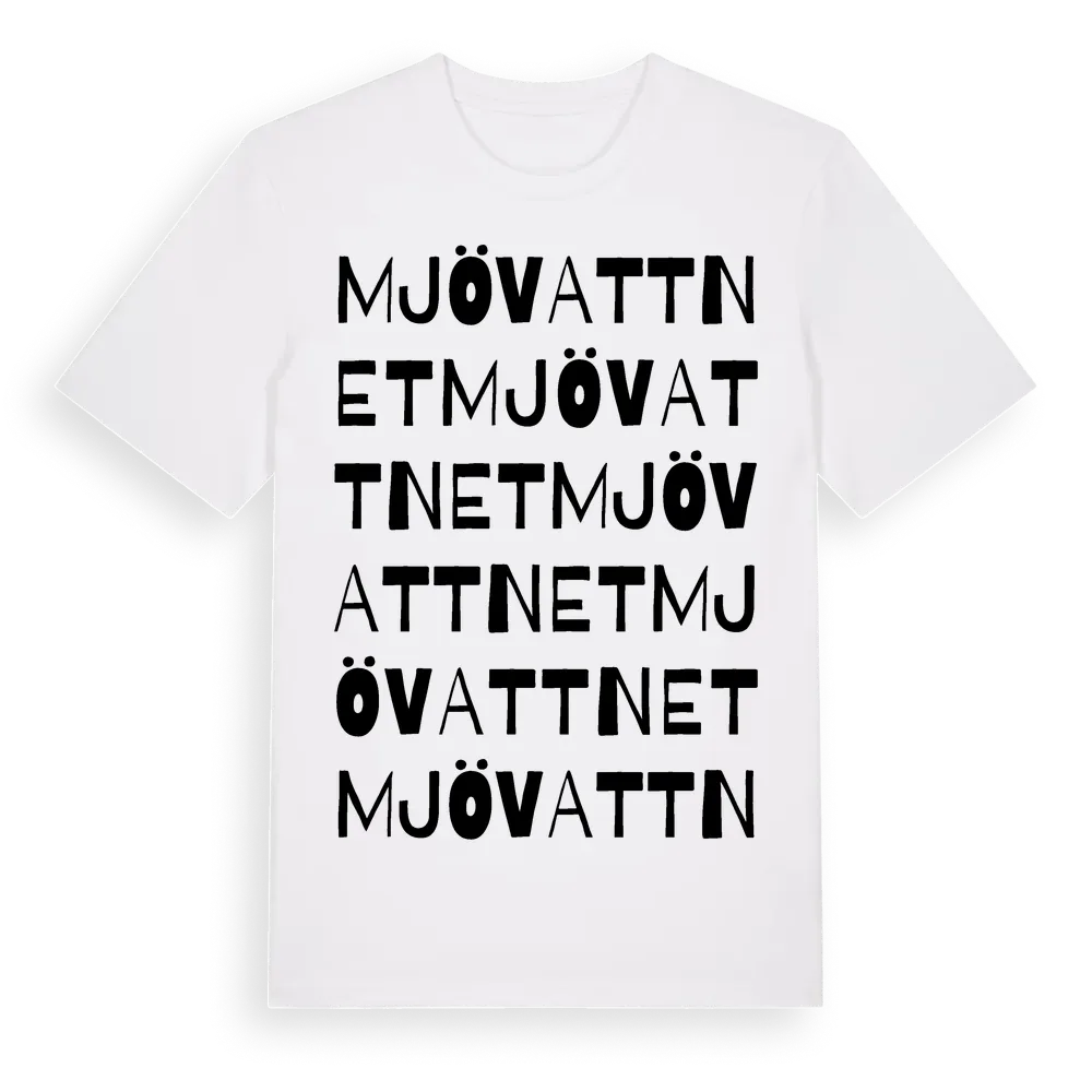 Mjövattnet ordlek t-shirt är inspirerad av byn Mjövattnet i Västernorrlands län, Sverige. Tröjan är designad för dig som har en speciell koppling till platsen – oavsett om du bor här, har rötterna här eller bara älskar Mjövattnet.