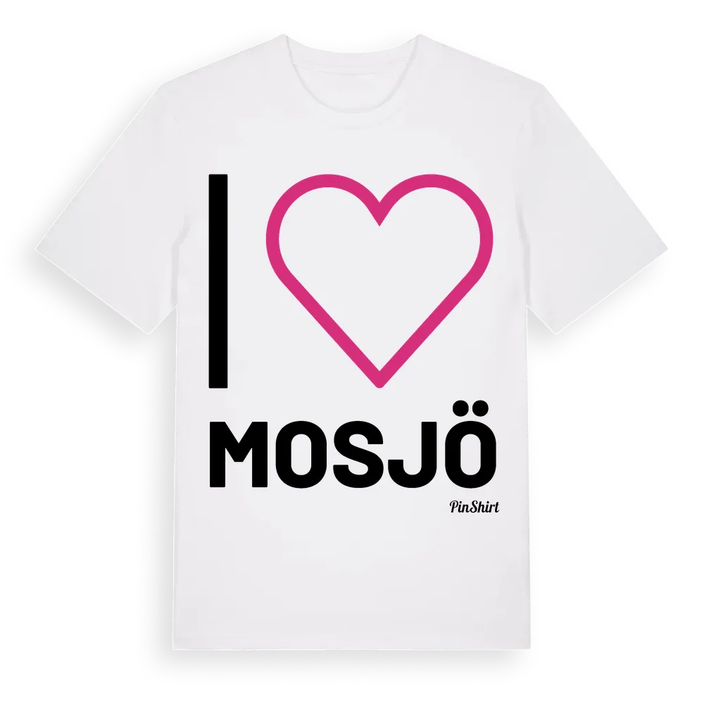 Det klassiska "I ❤ Mosjö"-motivet i stort format som täcker hela bröstet. För dig som vill visa kärleken till Mosjö på riktigt. Premium bomull, unisex – från byn Mosjö i Västernorrlands län.