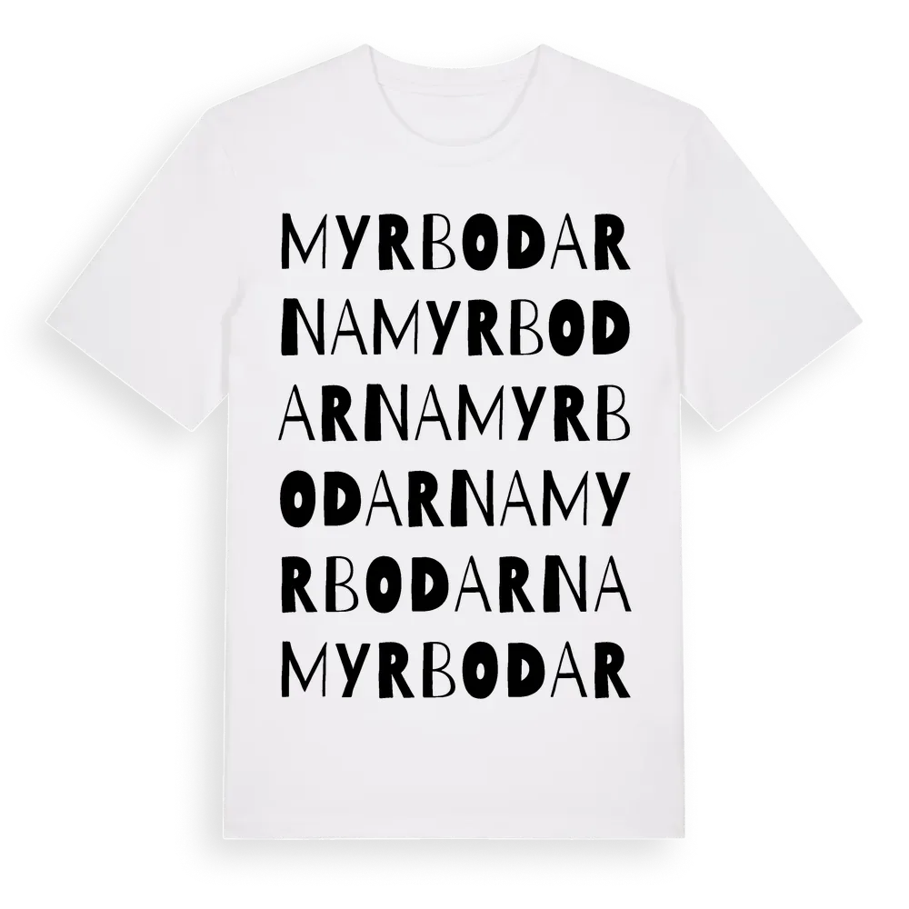 Myrbodarna ordlek t-shirt är inspirerad av Myrbodarna i Västernorrlands län, Sverige. Tröjan är designad för dig som har en speciell koppling till platsen – oavsett om du bor här, har rötterna här eller bara älskar Myrbodarna.