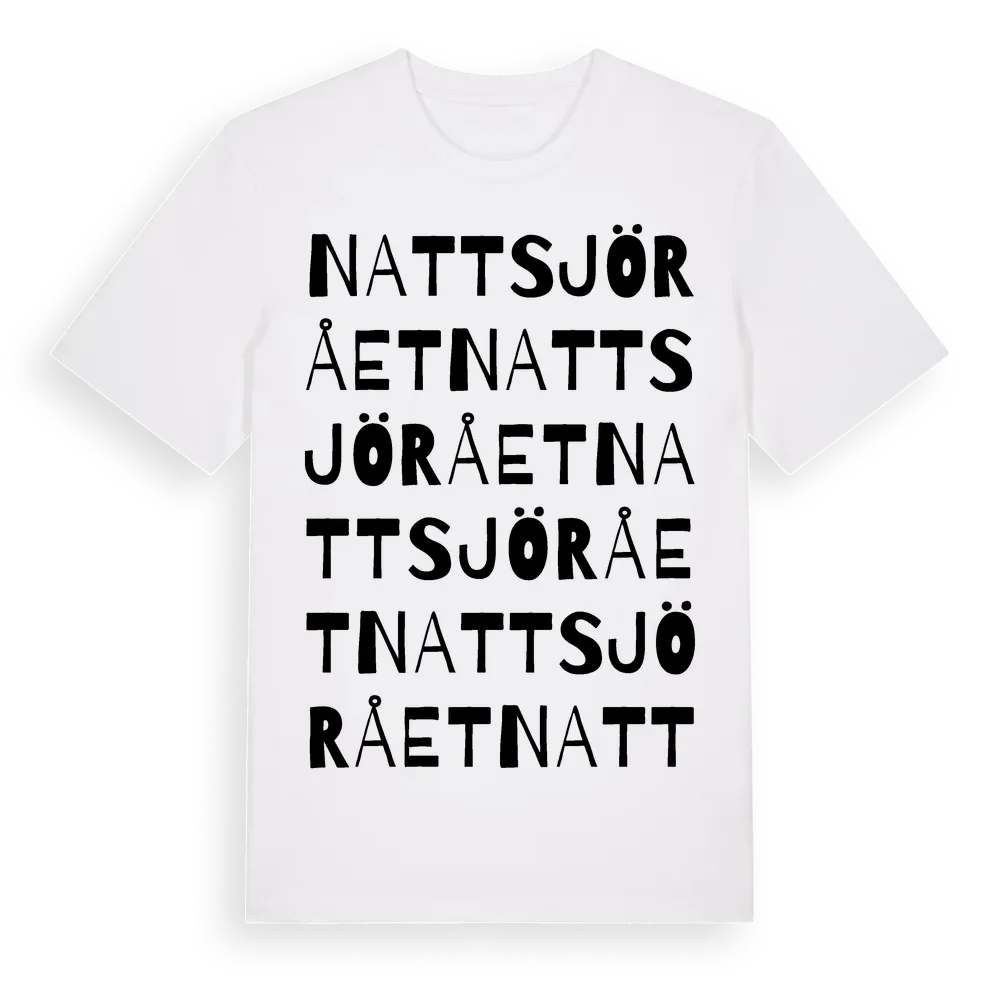 Nattsjörået ordlek t-shirt är inspirerad av Nattsjörået i Västernorrlands län, Sverige. Tröjan är designad för dig som har en speciell koppling till platsen – oavsett om du bor här, har rötterna här eller bara älskar Nattsjörået.