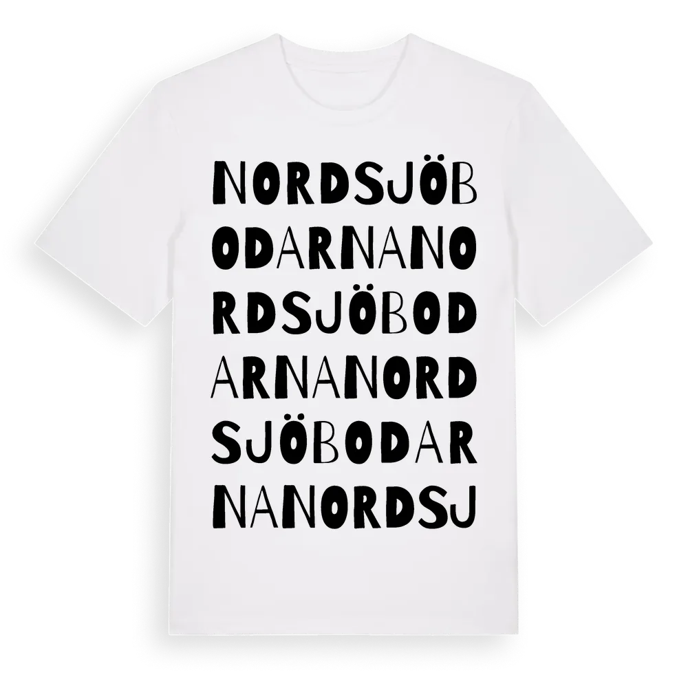 Nordsjöbodarna ordlek t-shirt är inspirerad av Nordsjöbodarna i Västernorrlands län, Sverige. Tröjan är designad för dig som har en speciell koppling till platsen – oavsett om du bor här, har rötterna här eller bara älskar Nordsjöbodarna.