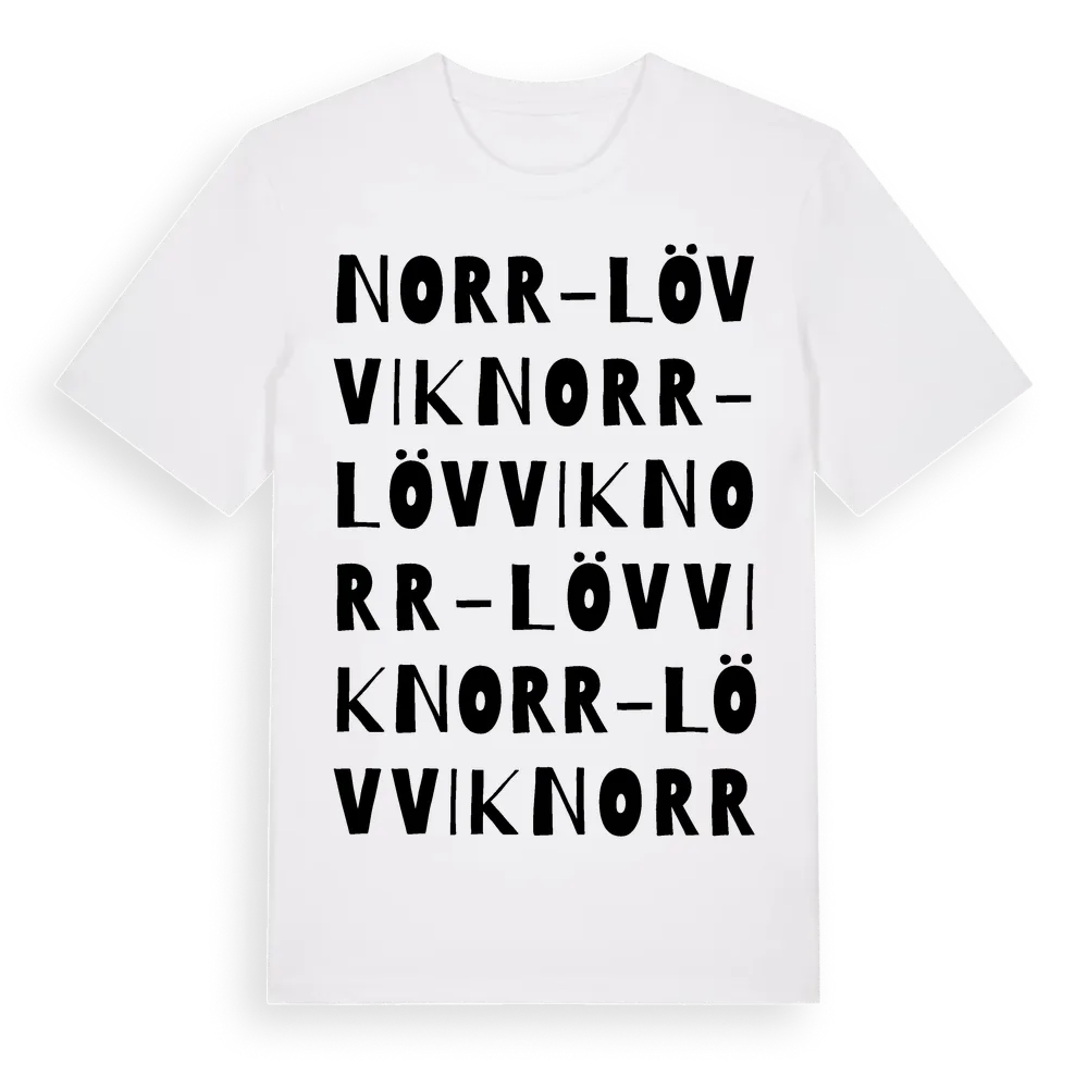 Norr-Lövvik ordlek t-shirt är inspirerad av byn Norr-Lövvik i Västernorrlands län, Sverige. Tröjan är designad för dig som har en speciell koppling till platsen – oavsett om du bor här, har rötterna här eller bara älskar Norr-Lövvik.
