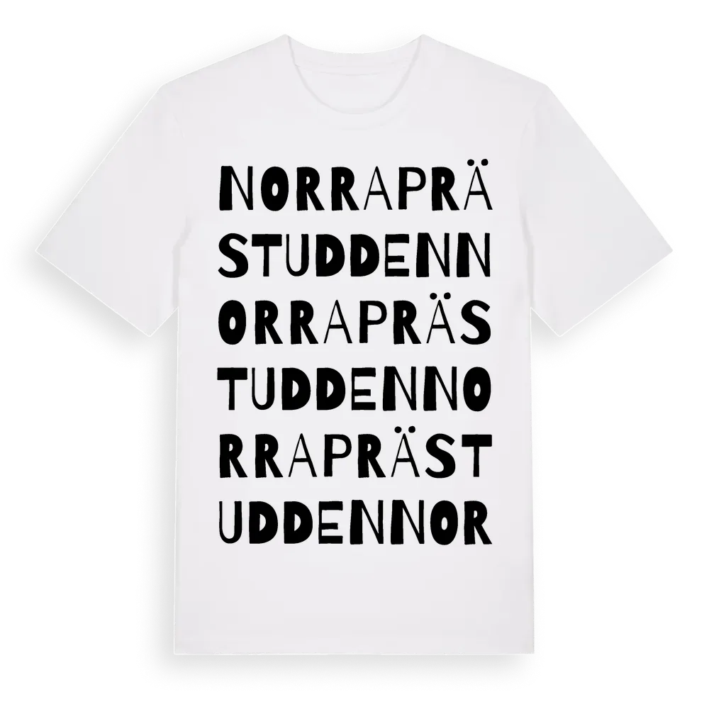 Norra Prästudden ordlek t-shirt är inspirerad av Norra Prästudden i Västernorrlands län, Sverige. Tröjan är designad för dig som har en speciell koppling till platsen – oavsett om du bor här, har rötterna här eller bara älskar Norra Prästudden.