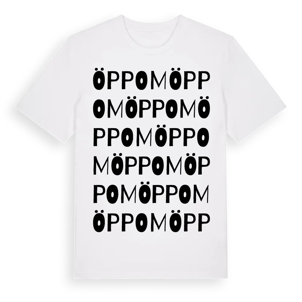 Öppom ordlek t-shirt är inspirerad av byn Öppom i Västernorrlands län, Sverige. Tröjan är designad för dig som har en speciell koppling till platsen – oavsett om du bor här, har rötterna här eller bara älskar Öppom.