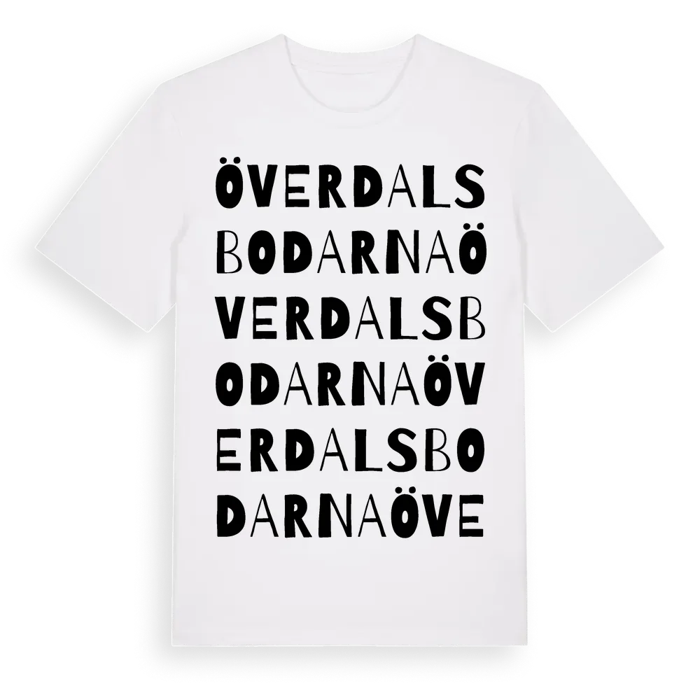 Överdalsbodarna ordlek t-shirt är inspirerad av Överdalsbodarna i Västernorrlands län, Sverige. Tröjan är designad för dig som har en speciell koppling till platsen – oavsett om du bor här, har rötterna här eller bara älskar Överdalsbodarna.
