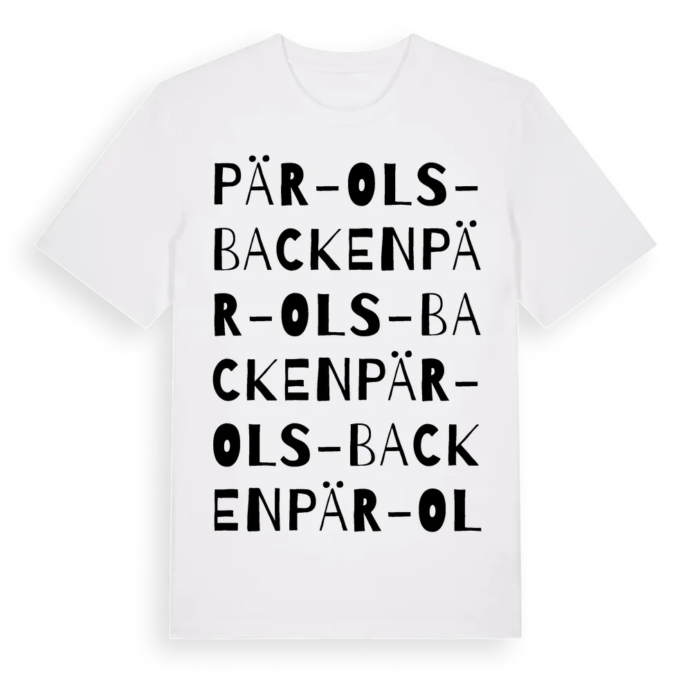 Pär-Ols-Backen ordlek t-shirt är inspirerad av Pär-Ols-Backen i Västernorrlands län, Sverige. Tröjan är designad för dig som har en speciell koppling till platsen – oavsett om du bor här, har rötterna här eller bara älskar Pär-Ols-Backen.