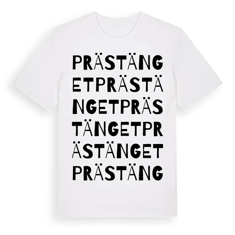 En ordlek byggd på Prästängets namn. Subtilt och klurig – ett motiv som bara de som verkligen känner platsen fullt ut förstår. Premium bomull, unisex – från Prästänget i Västernorrlands län.