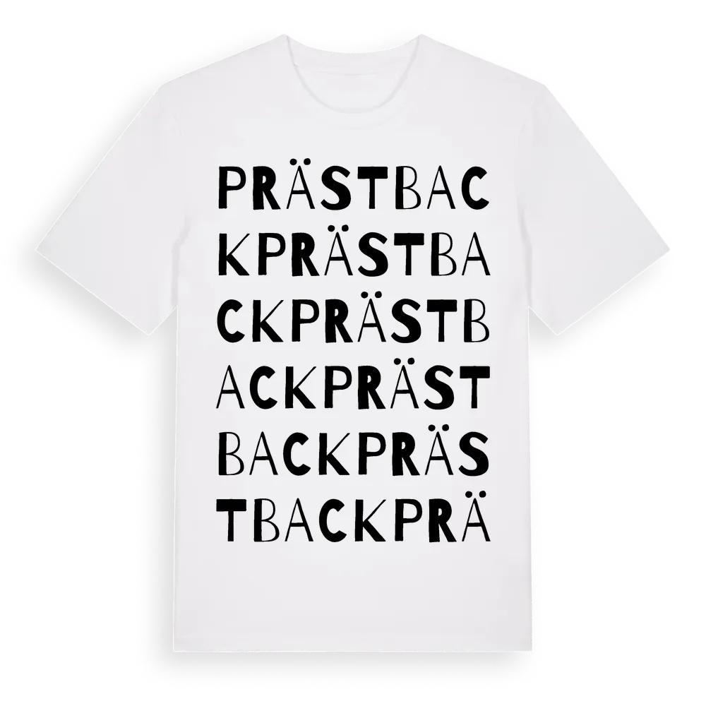 Prästback ordlek t-shirt är inspirerad av Prästback i Västernorrlands län, Sverige. Tröjan är designad för dig som har en speciell koppling till platsen – oavsett om du bor här, har rötterna här eller bara älskar Prästback.