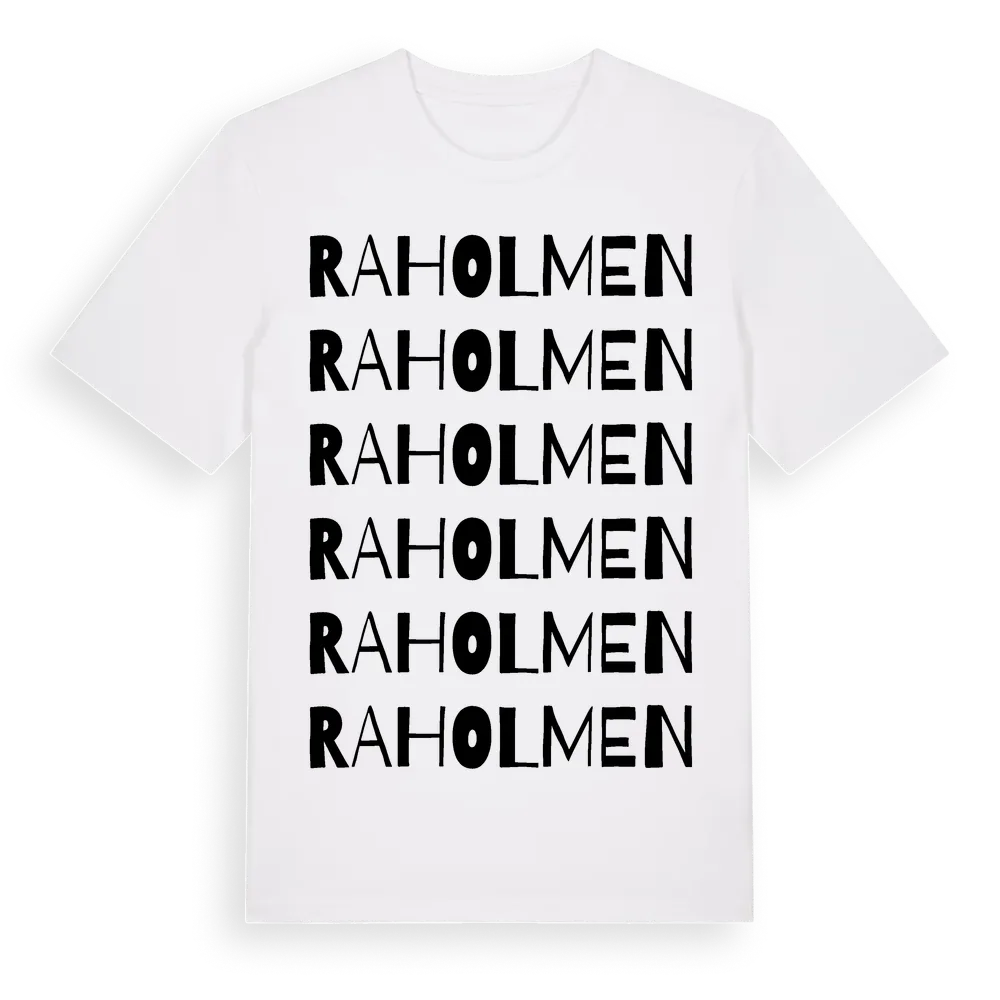 En ordlek byggd på Raholmens namn. Subtilt och klurig – ett motiv som bara de som verkligen känner platsen fullt ut förstår. Premium bomull, unisex – från byn Raholmen i Västernorrlands län.