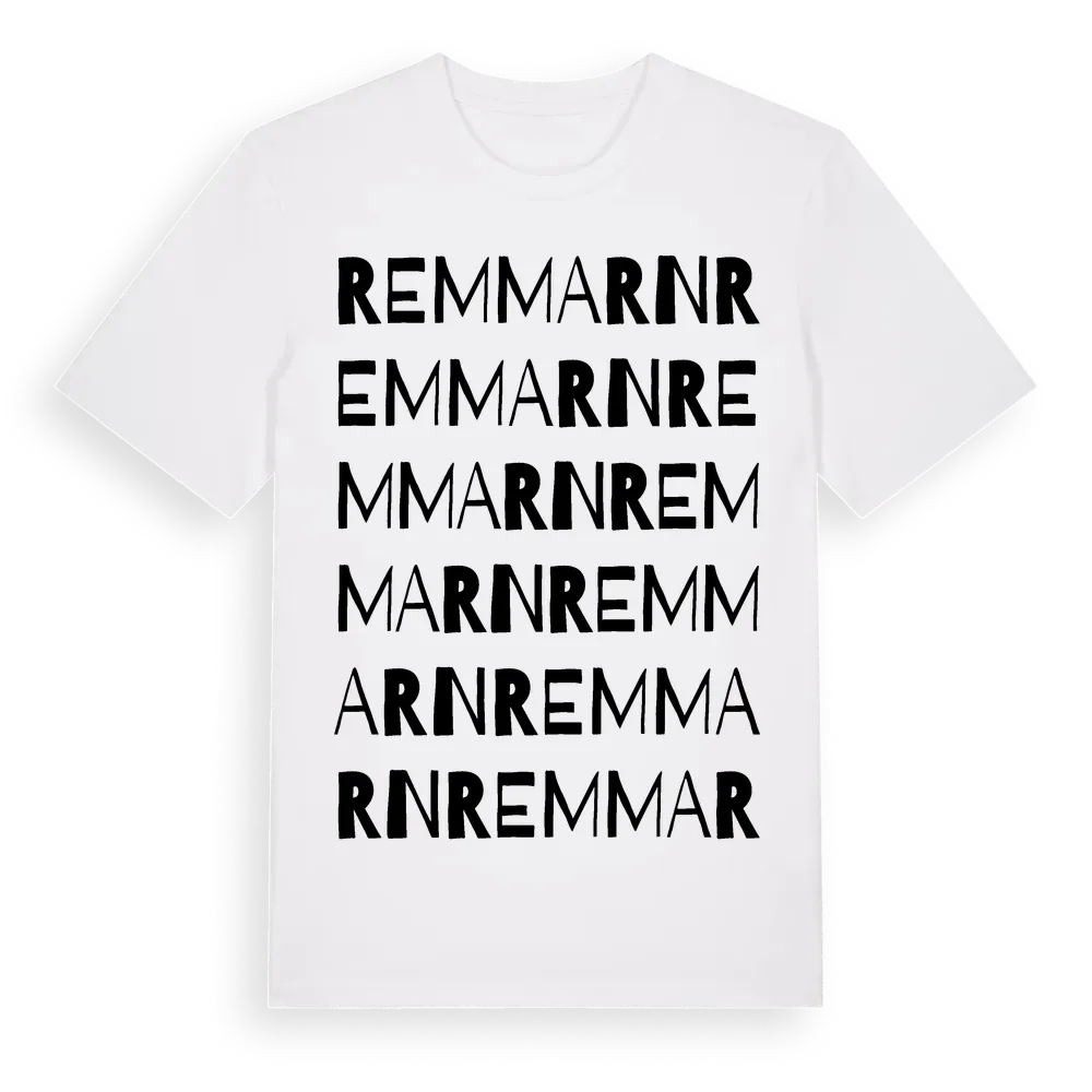 Remmarn ordlek t-shirt är inspirerad av byn Remmarn i Västernorrlands län, Sverige. Tröjan är designad för dig som har en speciell koppling till platsen – oavsett om du bor här, har rötterna här eller bara älskar Remmarn.