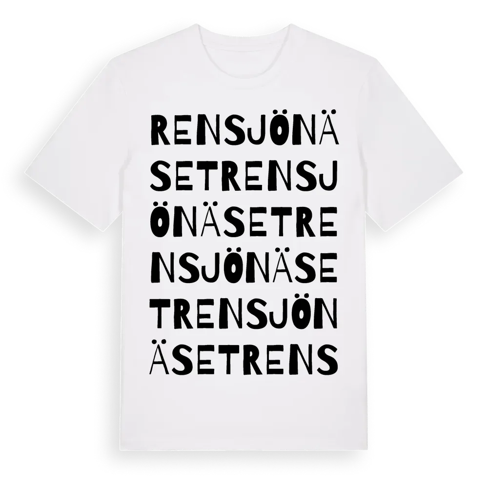 Rensjönäset ordlek t-shirt är inspirerad av byn Rensjönäset i Västernorrlands län, Sverige. Tröjan är designad för dig som har en speciell koppling till platsen – oavsett om du bor här, har rötterna här eller bara älskar Rensjönäset.