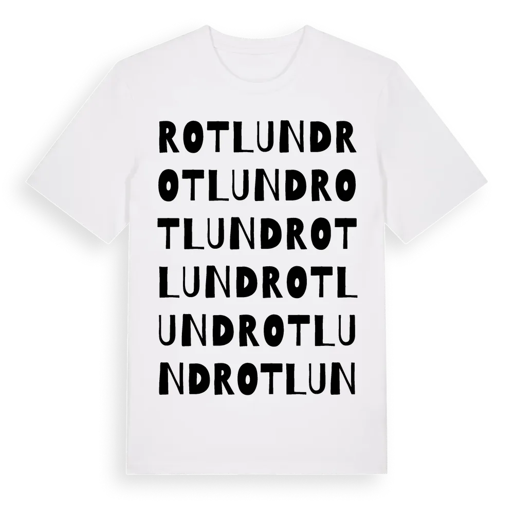 Rotlund ordlek t-shirt är inspirerad av stadsdelen Rotlund i Västernorrlands län, Sverige. Tröjan är designad för dig som har en speciell koppling till platsen – oavsett om du bor här, har rötterna här eller bara älskar Rotlund.