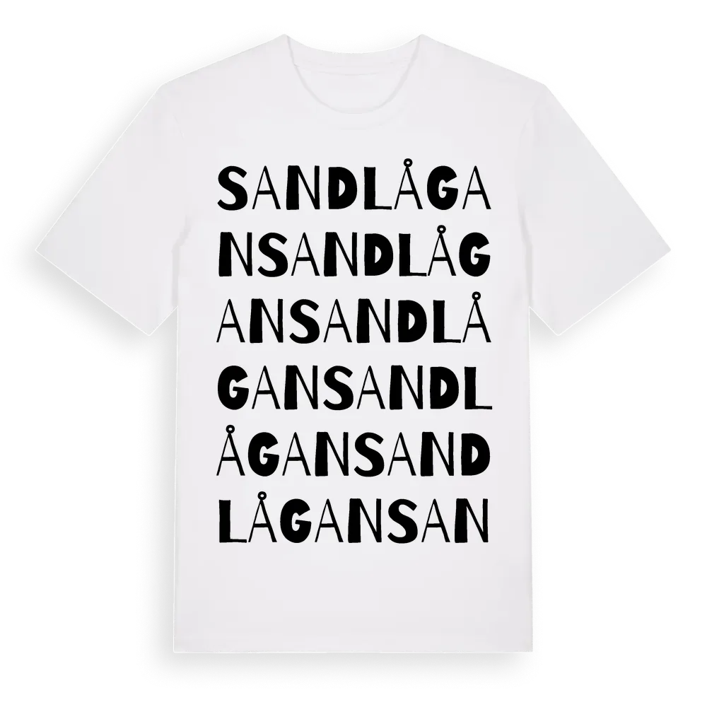Sandlågan ordlek t-shirt är inspirerad av byn Sandlågan i Västernorrlands län, Sverige. Tröjan är designad för dig som har en speciell koppling till platsen – oavsett om du bor här, har rötterna här eller bara älskar Sandlågan.