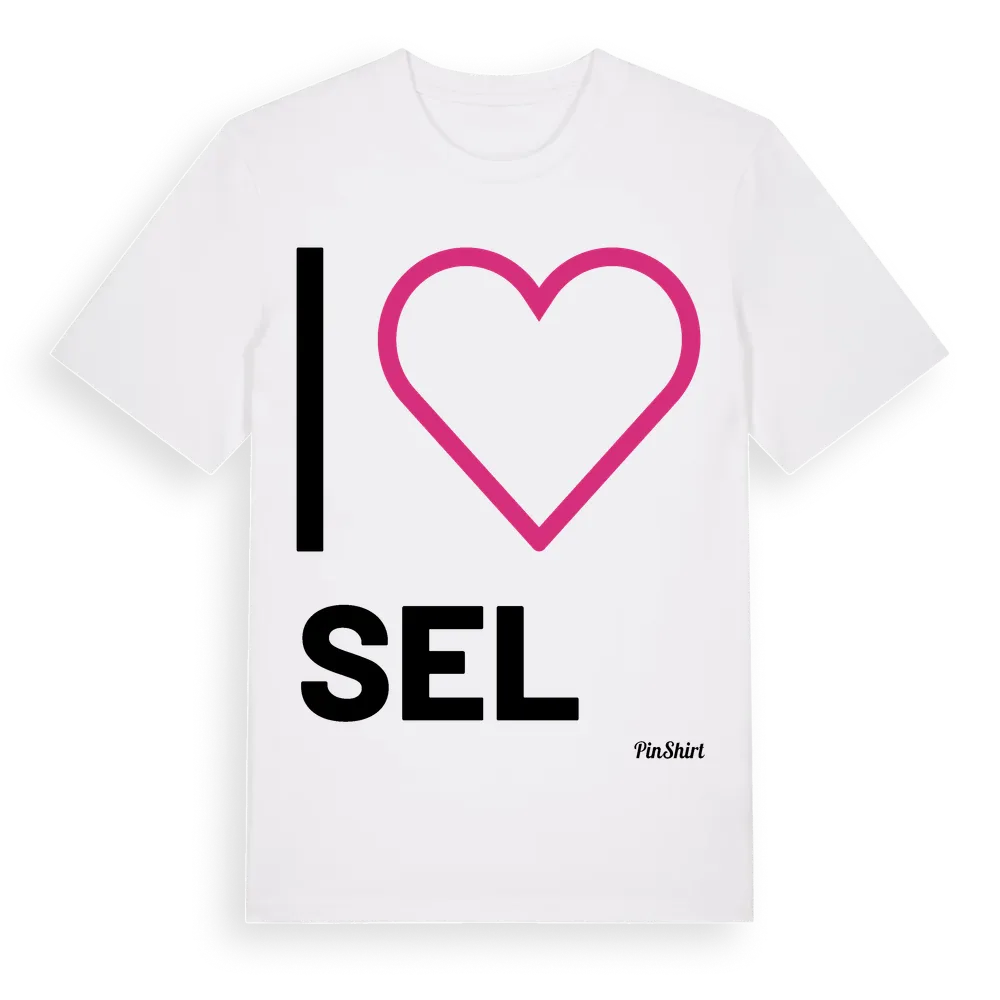 Jag älskar Sel t-shirt stort tryck är inspirerad av byn Sel i Västernorrlands län, Sverige. Tröjan är designad för dig som har en speciell koppling till platsen – oavsett om du bor här, har rötterna här eller bara älskar Sel.