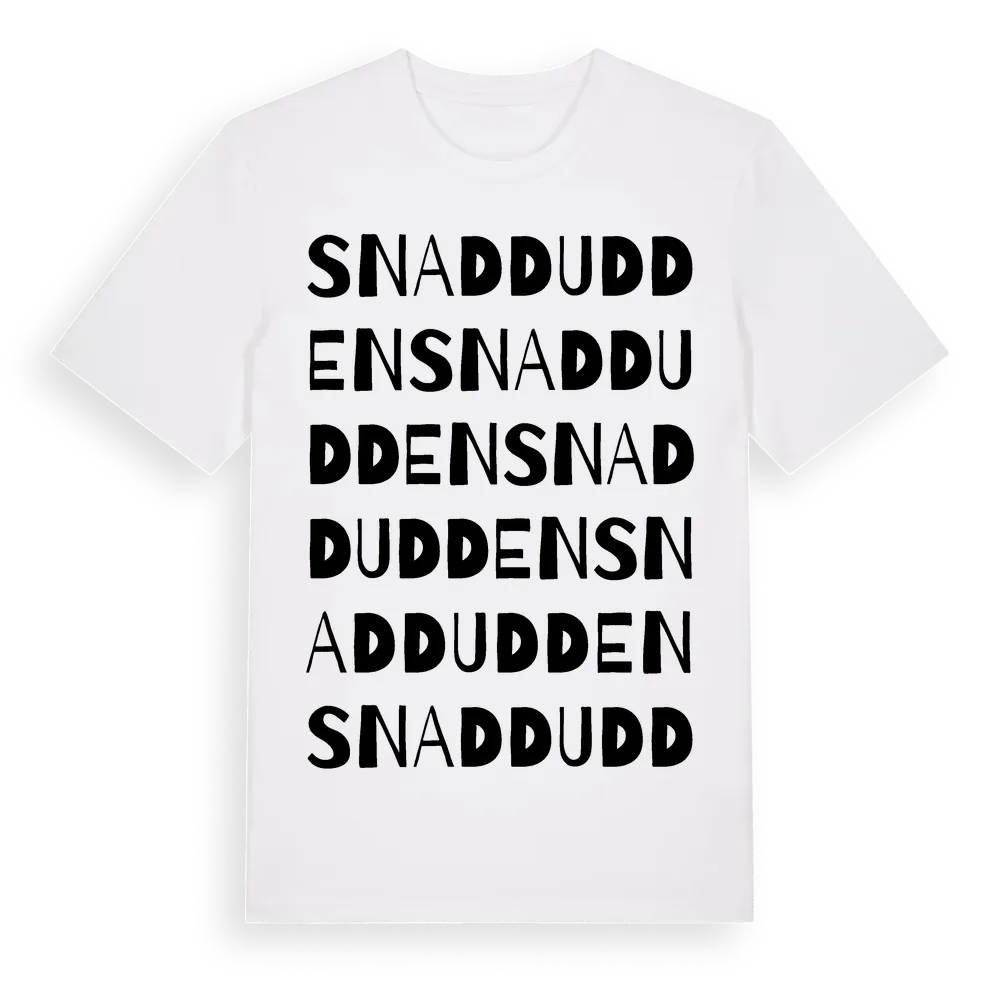 Snaddudden ordlek t-shirt är inspirerad av Snaddudden i Västernorrlands län, Sverige. Tröjan är designad för dig som har en speciell koppling till platsen – oavsett om du bor här, har rötterna här eller bara älskar Snaddudden.