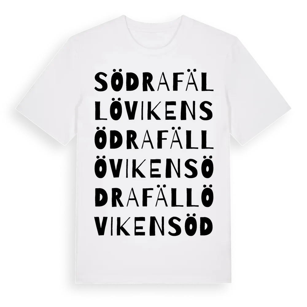 Södra Fällöviken ordlek t-shirt är inspirerad av byn Södra Fällöviken i Västernorrlands län, Sverige. Tröjan är designad för dig som har en speciell koppling till platsen – oavsett om du bor här, har rötterna här eller bara älskar Södra Fällöviken.