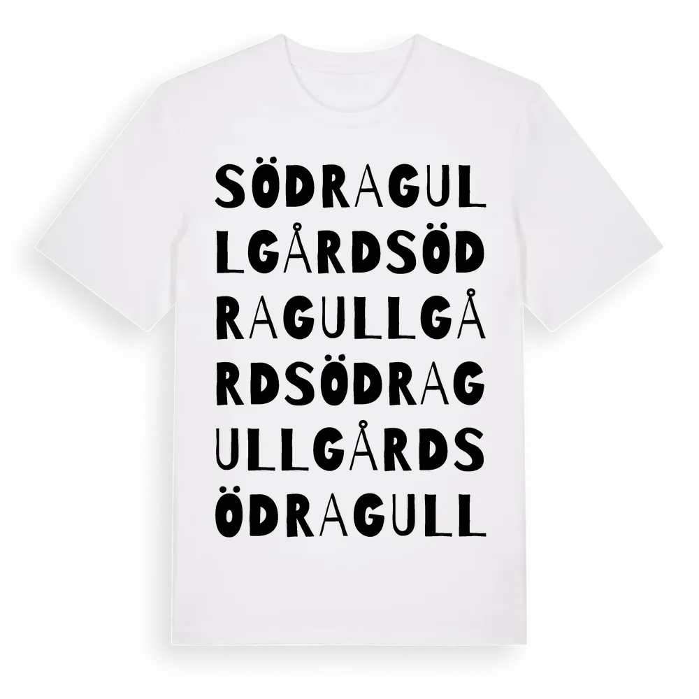 Södra Gullgård ordlek t-shirt är inspirerad av byn Södra Gullgård i Västernorrlands län, Sverige. Tröjan är designad för dig som har en speciell koppling till platsen – oavsett om du bor här, har rötterna här eller bara älskar Södra Gullgård.