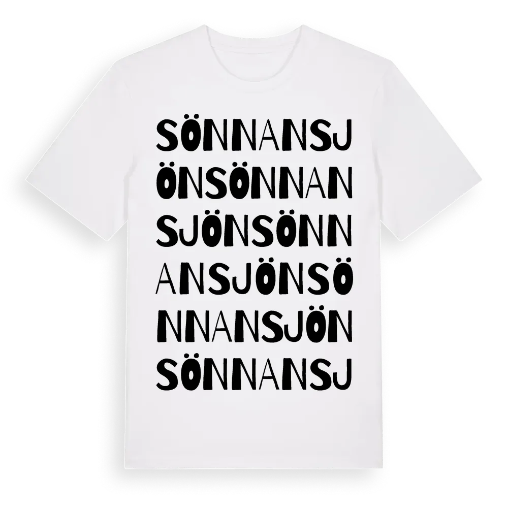 Sönnansjön ordlek t-shirt är inspirerad av byn Sönnansjön i Västernorrlands län, Sverige. Tröjan är designad för dig som har en speciell koppling till platsen – oavsett om du bor här, har rötterna här eller bara älskar Sönnansjön.