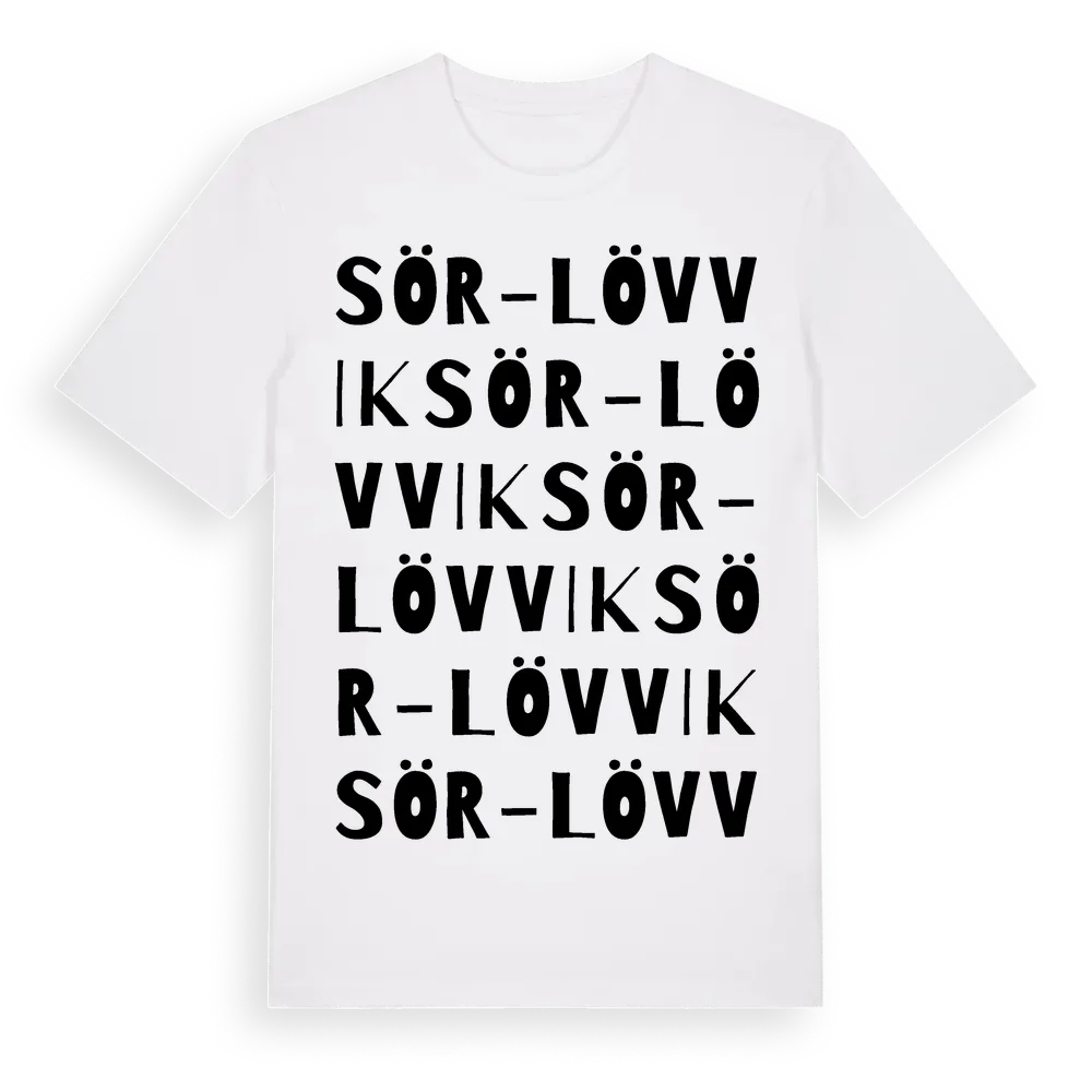 Sör-Lövvik ordlek t-shirt är inspirerad av byn Sör-Lövvik i Västernorrlands län, Sverige. Tröjan är designad för dig som har en speciell koppling till platsen – oavsett om du bor här, har rötterna här eller bara älskar Sör-Lövvik.