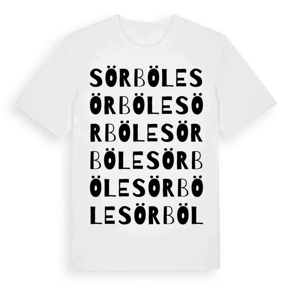 Sörböle ordlek t-shirt är inspirerad av byn Sörböle i Västernorrlands län, Sverige. Tröjan är designad för dig som har en speciell koppling till platsen – oavsett om du bor här, har rötterna här eller bara älskar Sörböle.