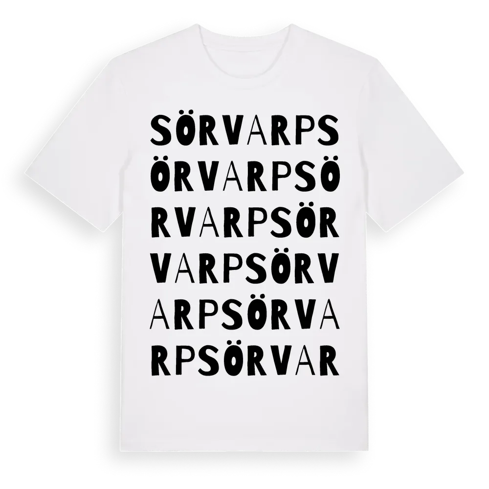 Sörvarp ordlek t-shirt är inspirerad av Sörvarp i Västernorrlands län, Sverige. Tröjan är designad för dig som har en speciell koppling till platsen – oavsett om du bor här, har rötterna här eller bara älskar Sörvarp.