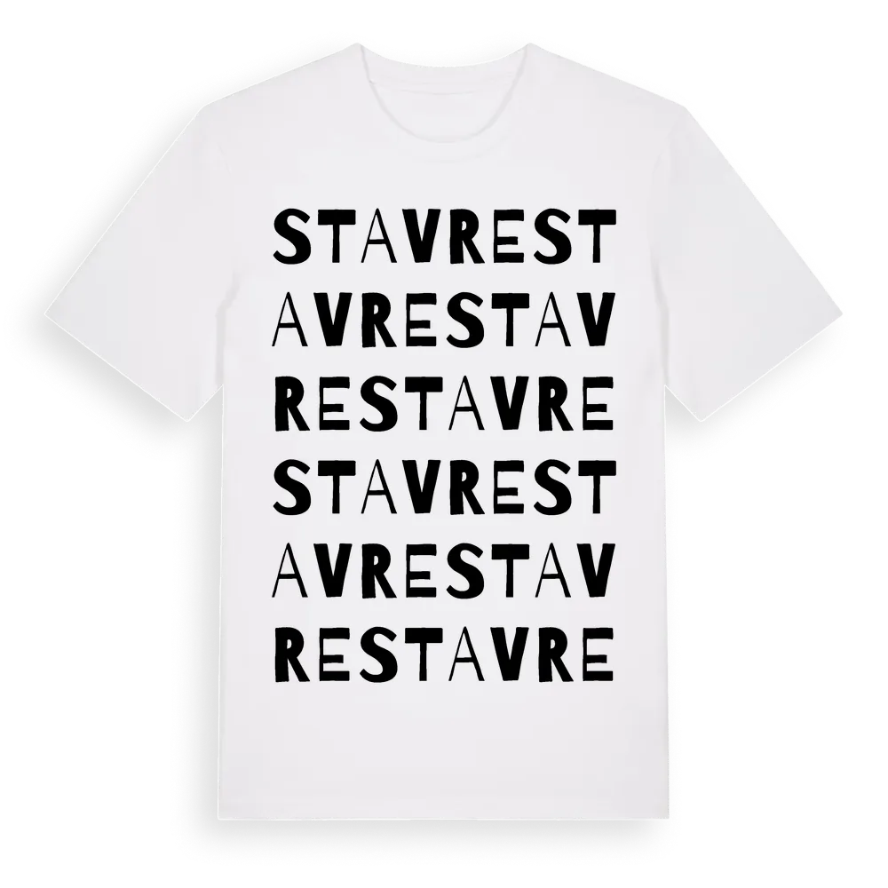 Stavre ordlek t-shirt är inspirerad av byn Stavre i Västernorrlands län, Sverige. Tröjan är designad för dig som har en speciell koppling till platsen – oavsett om du bor här, har rötterna här eller bara älskar Stavre.