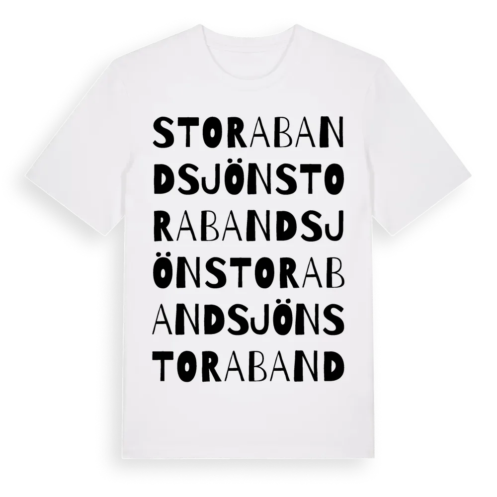 Stora Bandsjön ordlek t-shirt är inspirerad av byn Stora Bandsjön i Västernorrlands län, Sverige. Tröjan är designad för dig som har en speciell koppling till platsen – oavsett om du bor här, har rötterna här eller bara älskar Stora Bandsjön.