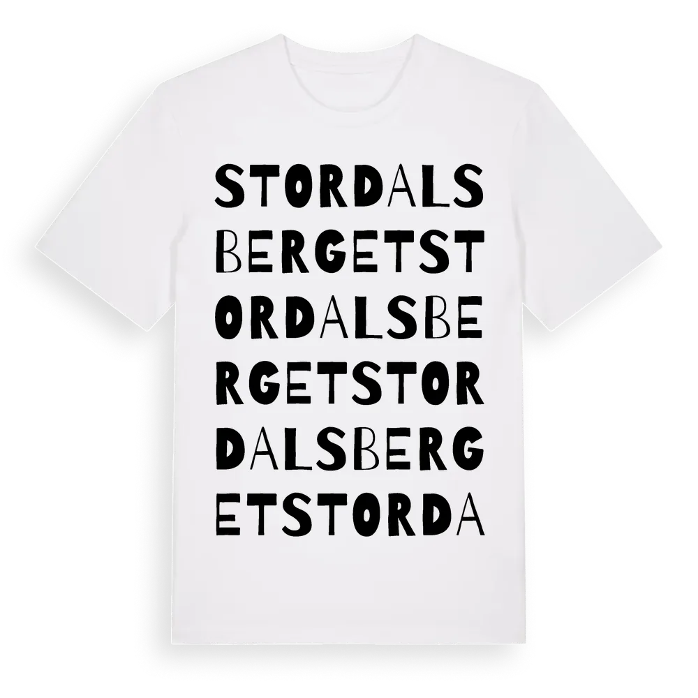 Stordalsberget ordlek t-shirt är inspirerad av Stordalsberget i Västernorrlands län, Sverige. Tröjan är designad för dig som har en speciell koppling till platsen – oavsett om du bor här, har rötterna här eller bara älskar Stordalsberget.