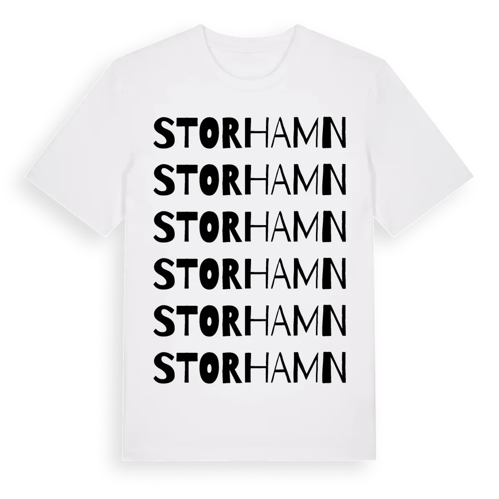 En ordlek byggd på Storhamns namn. Subtilt och klurig – ett motiv som bara de som verkligen känner platsen fullt ut förstår. Premium bomull, unisex – från byn Storhamn i Västernorrlands län.