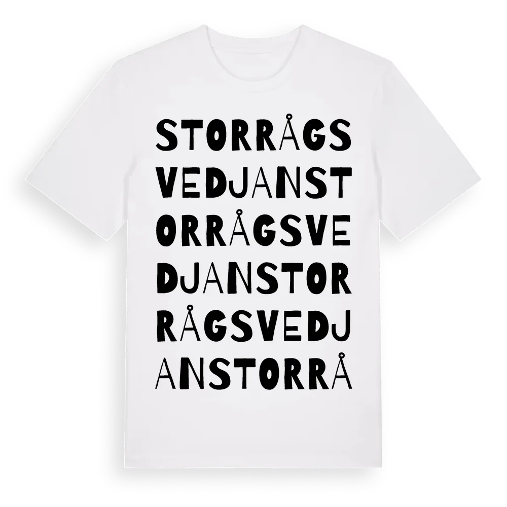 Storrågsvedjan ordlek t-shirt är inspirerad av Storrågsvedjan i Västernorrlands län, Sverige. Tröjan är designad för dig som har en speciell koppling till platsen – oavsett om du bor här, har rötterna här eller bara älskar Storrågsvedjan.