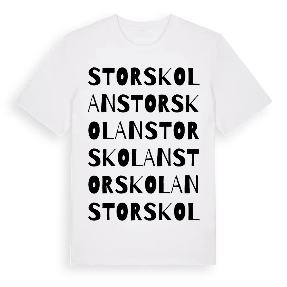 Storskolan ordlek t-shirt är inspirerad av Storskolan i Västernorrlands län, Sverige. Tröjan är designad för dig som har en speciell koppling till platsen – oavsett om du bor här, har rötterna här eller bara älskar Storskolan.