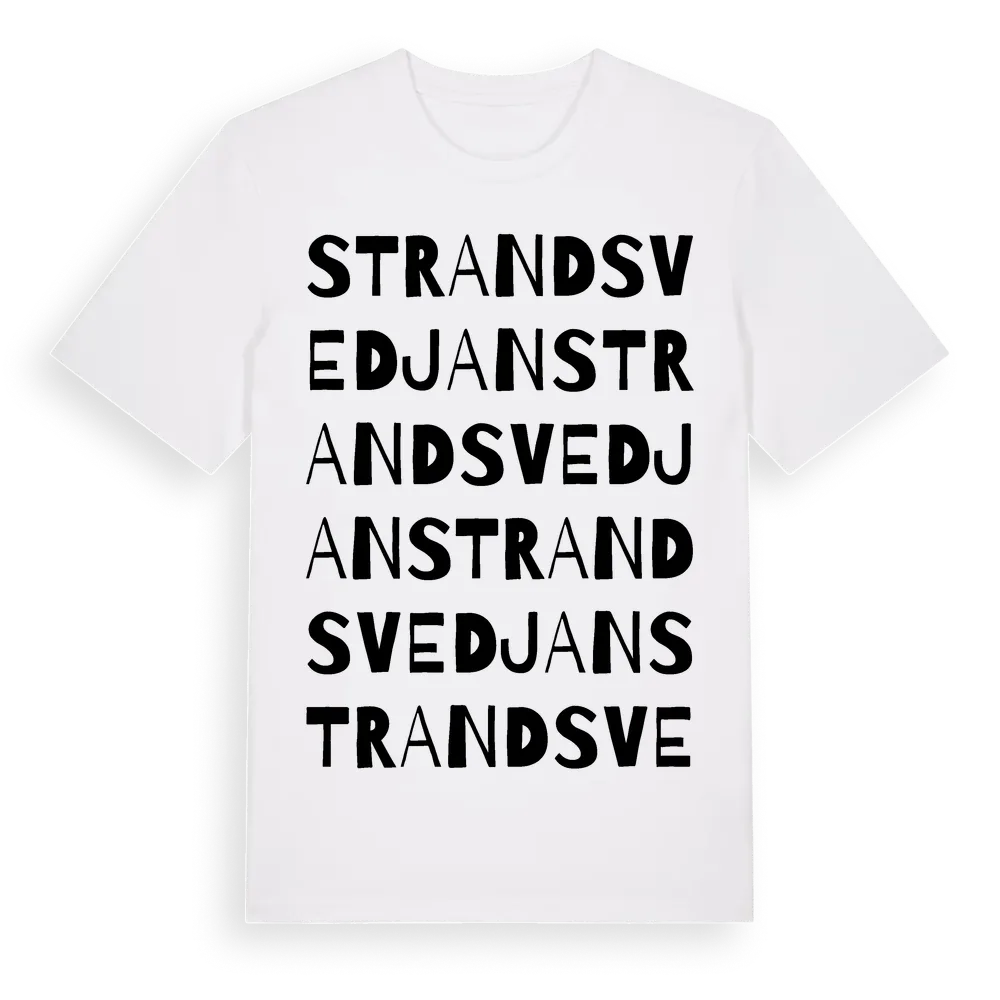 Strandsvedjan ordlek t-shirt är inspirerad av Strandsvedjan i Västernorrlands län, Sverige. Tröjan är designad för dig som har en speciell koppling till platsen – oavsett om du bor här, har rötterna här eller bara älskar Strandsvedjan.