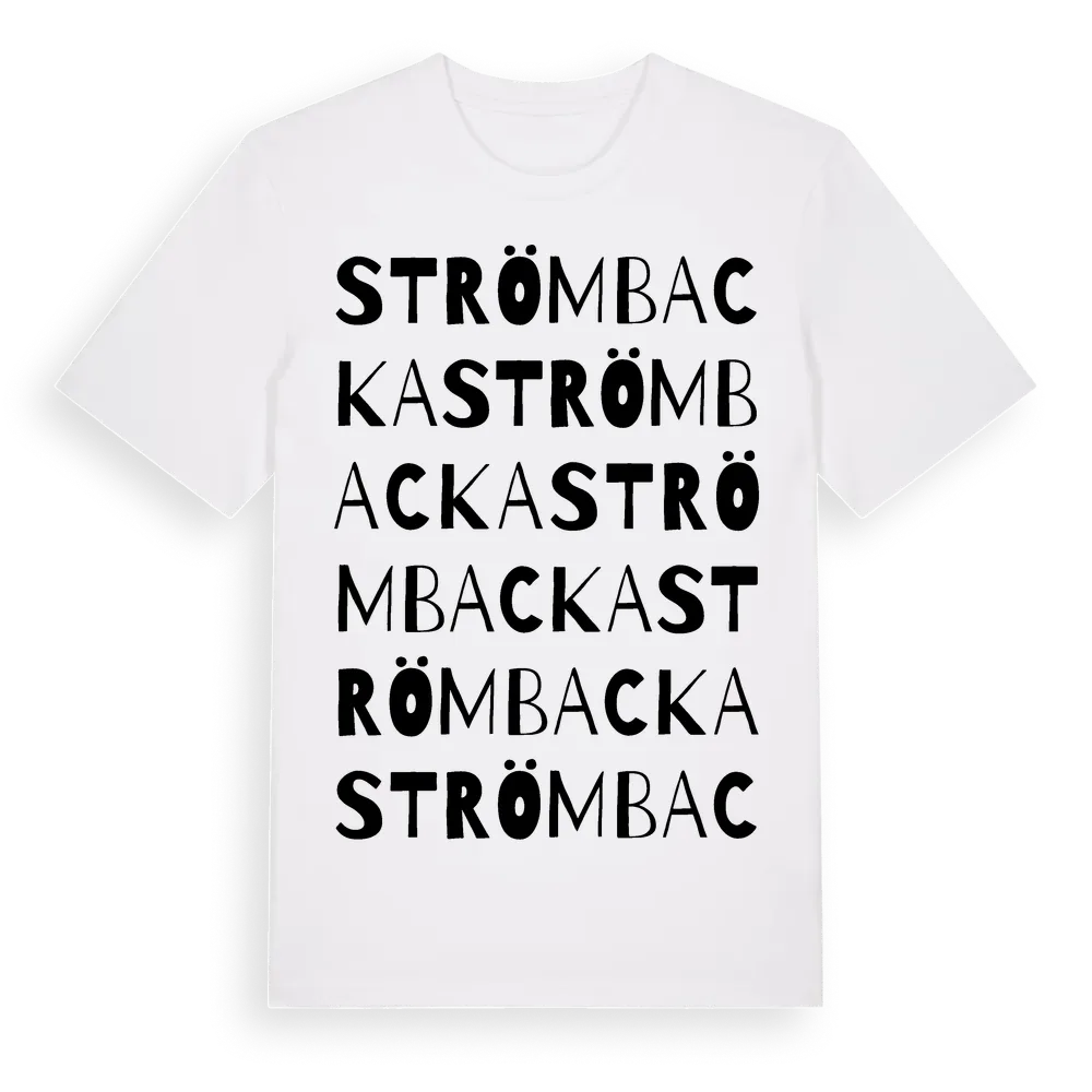 Strömbacka ordlek t-shirt är inspirerad av byn Strömbacka i Västernorrlands län, Sverige. Tröjan är designad för dig som har en speciell koppling till platsen – oavsett om du bor här, har rötterna här eller bara älskar Strömbacka.