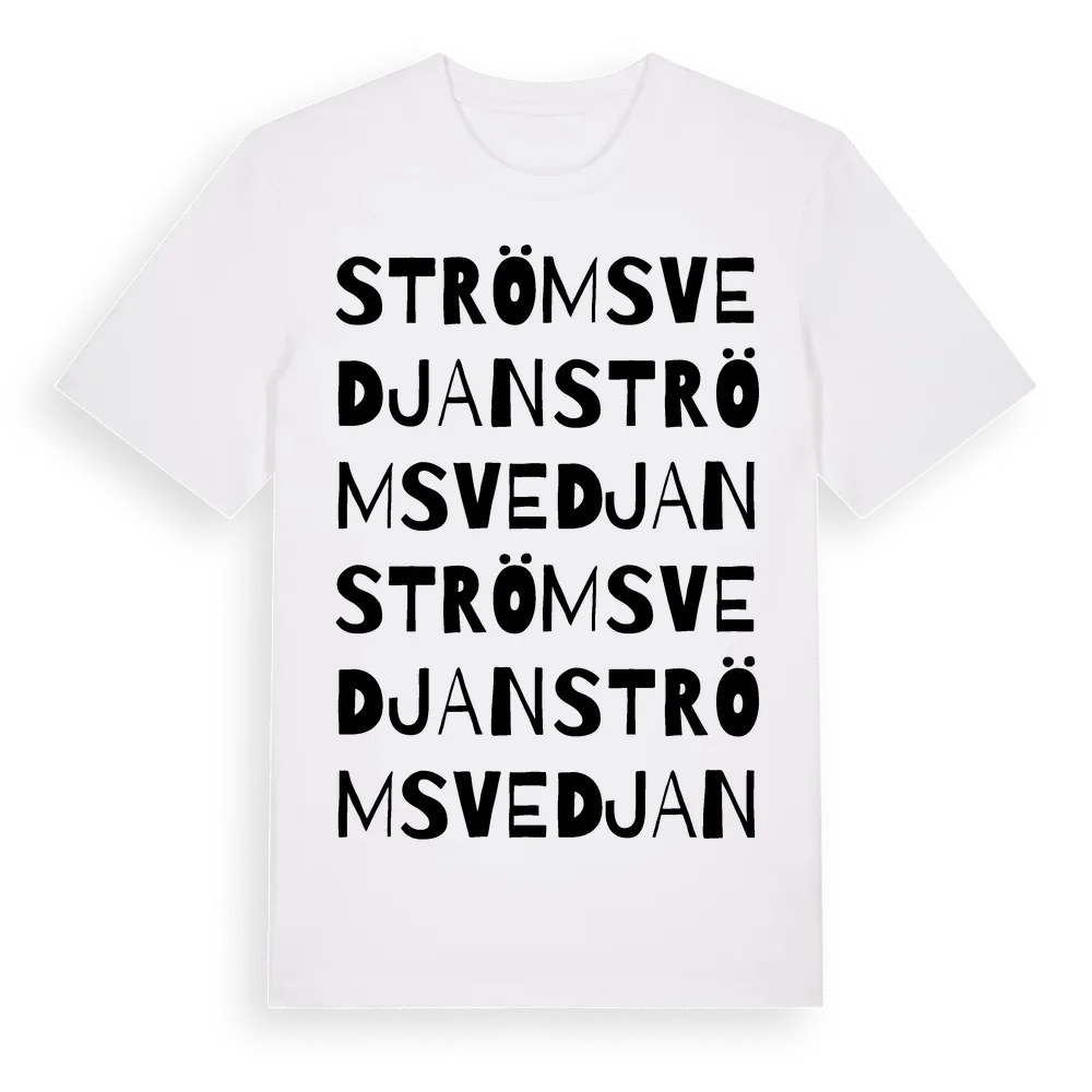 Strömsvedjan ordlek t-shirt är inspirerad av Strömsvedjan i Västernorrlands län, Sverige. Tröjan är designad för dig som har en speciell koppling till platsen – oavsett om du bor här, har rötterna här eller bara älskar Strömsvedjan.