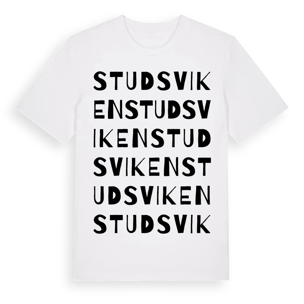 Studsviken ordlek t-shirt är inspirerad av byn Studsviken i Västernorrlands län, Sverige. Tröjan är designad för dig som har en speciell koppling till platsen – oavsett om du bor här, har rötterna här eller bara älskar Studsviken.