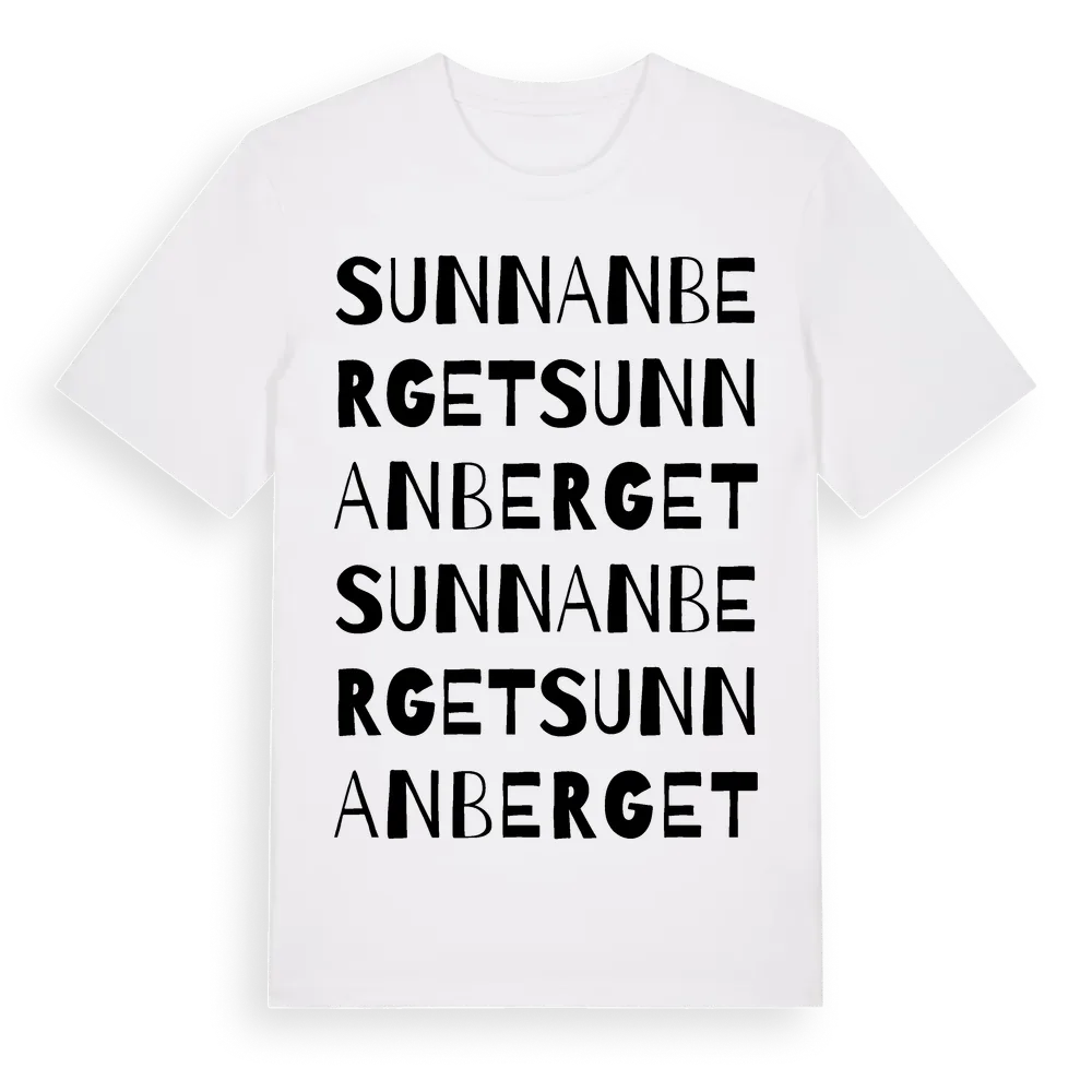 Sunnanberget ordlek t-shirt är inspirerad av byn Sunnanberget i Västernorrlands län, Sverige. Tröjan är designad för dig som har en speciell koppling till platsen – oavsett om du bor här, har rötterna här eller bara älskar Sunnanberget.