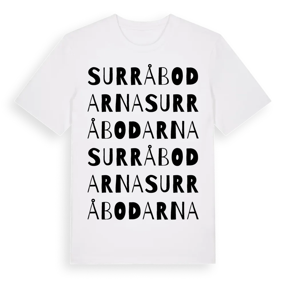 Surråbodarna ordlek t-shirt är inspirerad av Surråbodarna i Västernorrlands län, Sverige. Tröjan är designad för dig som har en speciell koppling till platsen – oavsett om du bor här, har rötterna här eller bara älskar Surråbodarna.