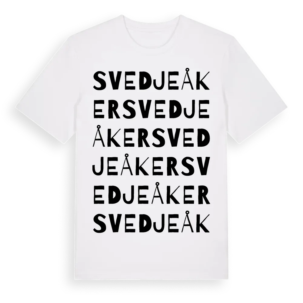 Svedjeåker ordlek t-shirt är inspirerad av byn Svedjeåker i Västernorrlands län, Sverige. Tröjan är designad för dig som har en speciell koppling till platsen – oavsett om du bor här, har rötterna här eller bara älskar Svedjeåker.