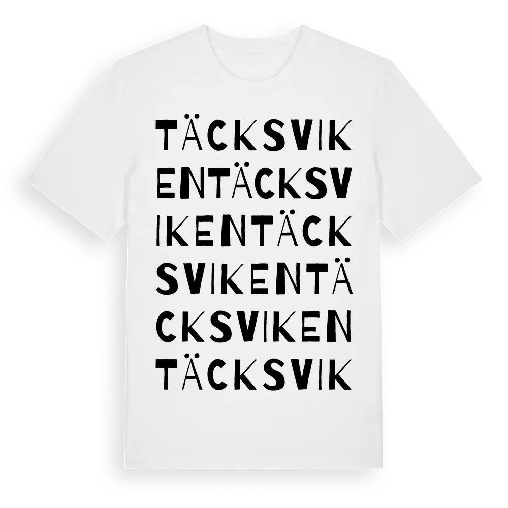 Täcksviken ordlek t-shirt är inspirerad av Täcksviken i Västernorrlands län, Sverige. Tröjan är designad för dig som har en speciell koppling till platsen – oavsett om du bor här, har rötterna här eller bara älskar Täcksviken.