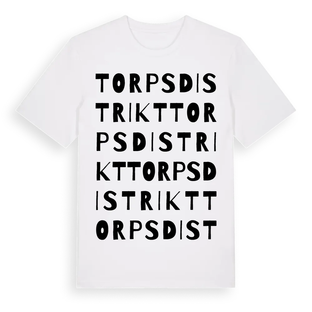 Torps Distrikt ordlek t-shirt är inspirerad av Torps Distrikt i Västernorrlands län, Sverige. Tröjan är designad för dig som har en speciell koppling till platsen – oavsett om du bor här, har rötterna här eller bara älskar Torps Distrikt.