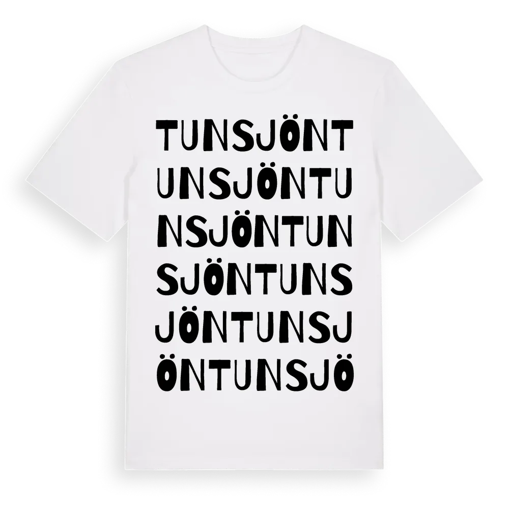 Tunsjön ordlek t-shirt är inspirerad av byn Tunsjön i Västernorrlands län, Sverige. Tröjan är designad för dig som har en speciell koppling till platsen – oavsett om du bor här, har rötterna här eller bara älskar Tunsjön.