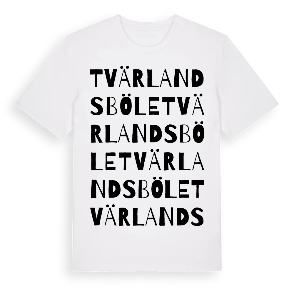 Tvärlandsböle ordlek t-shirt är inspirerad av byn Tvärlandsböle i Västernorrlands län, Sverige. Tröjan är designad för dig som har en speciell koppling till platsen – oavsett om du bor här, har rötterna här eller bara älskar Tvärlandsböle.