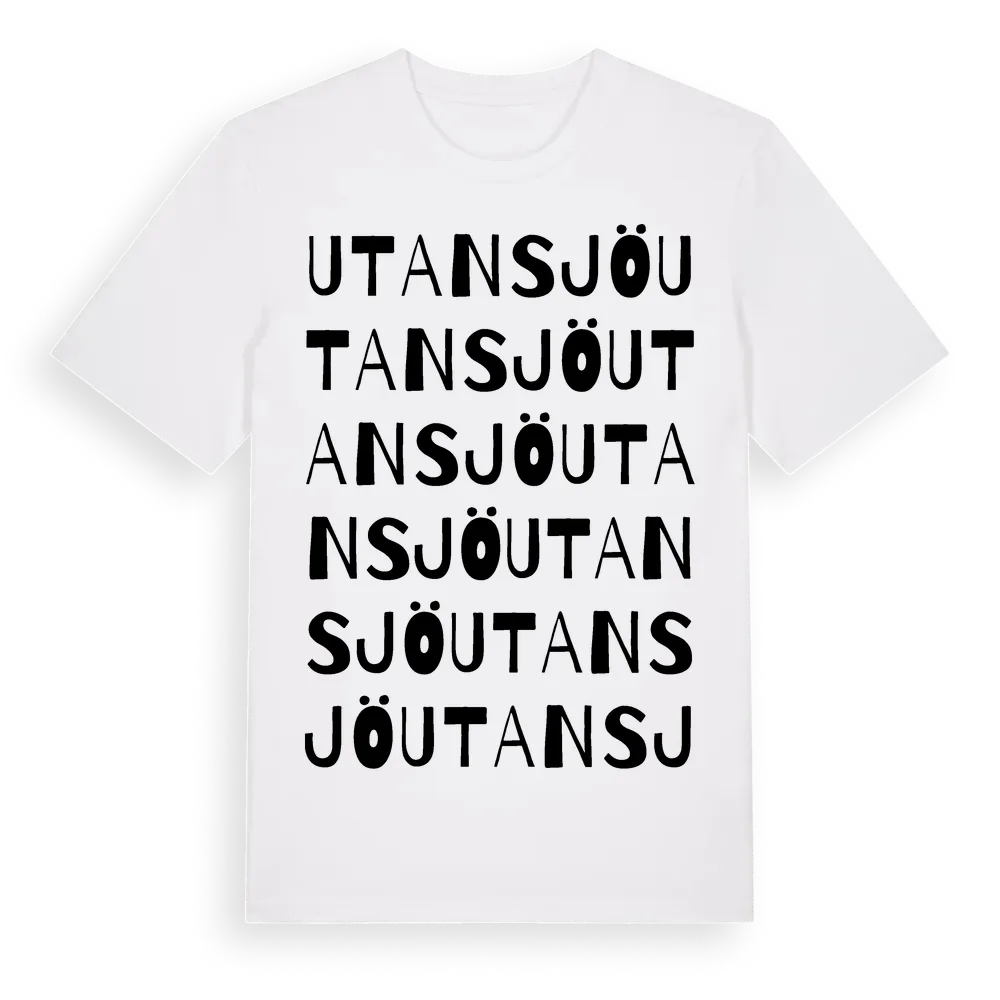 Utansjö ordlek t-shirt är inspirerad av byn Utansjö i Västernorrlands län, Sverige. Tröjan är designad för dig som har en speciell koppling till platsen – oavsett om du bor här, har rötterna här eller bara älskar Utansjö.